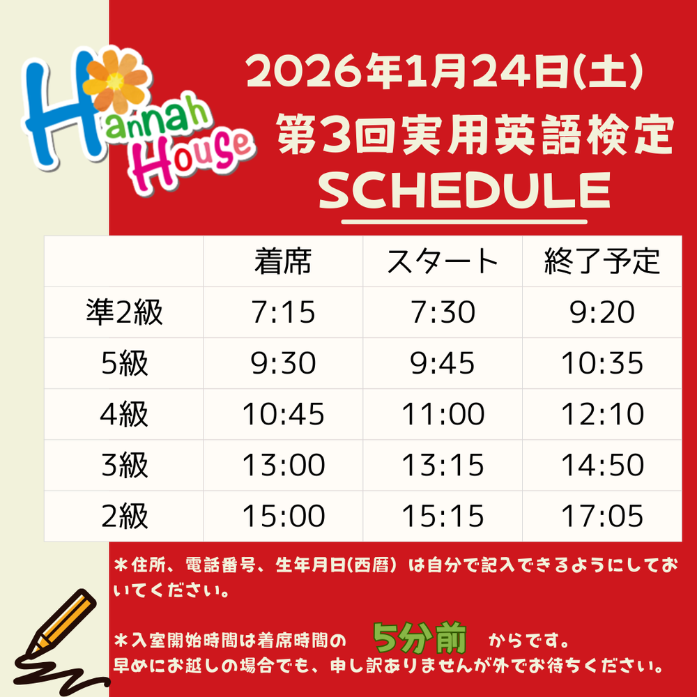 この度は英検受験にお申し込みいただき、誠にありがとうございます。 英検当日の時間割と、受験に関する重要な注意事項を改めてご連絡いたします。