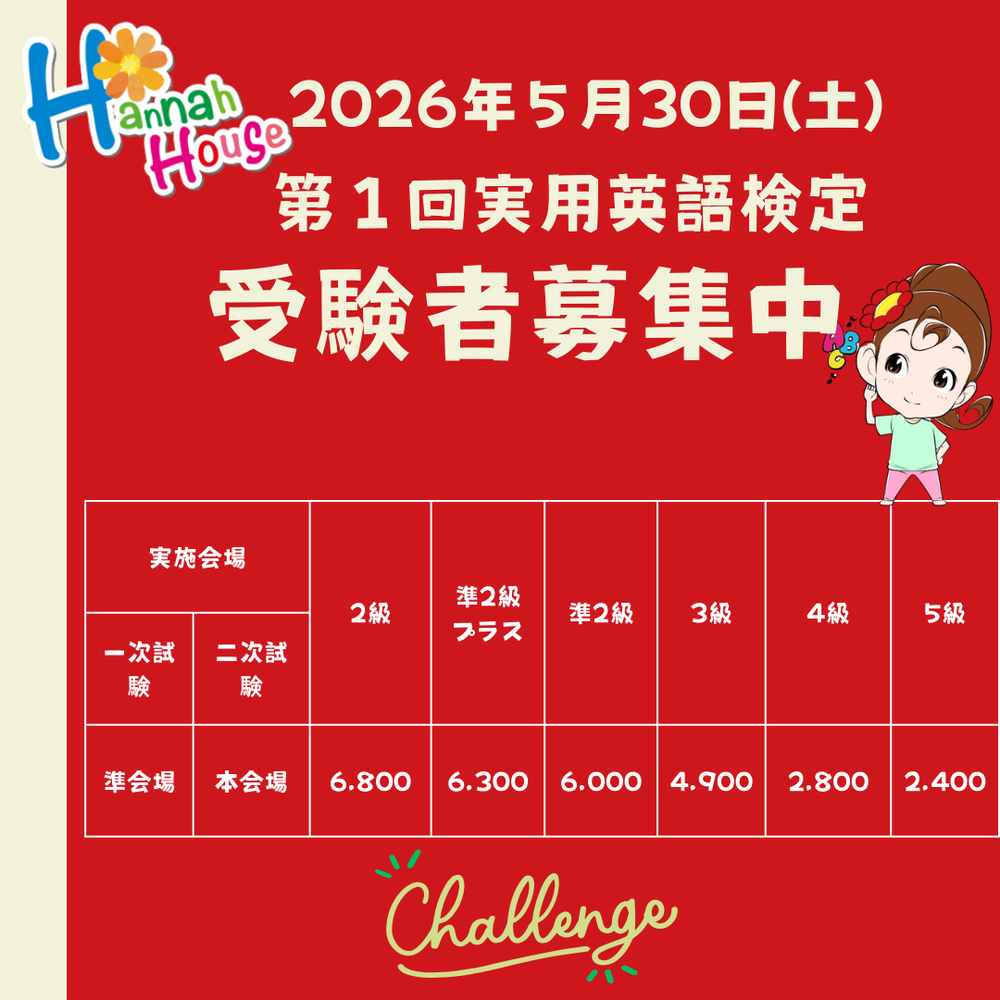 ハナハウスでは、本年度も「第1回 実用英語技能検定(英検)」を準会場として実施することにいたしました。 日頃の学習の成果を確認し、自信につなげる絶好の機会です。ぜひ挑戦してみてください。